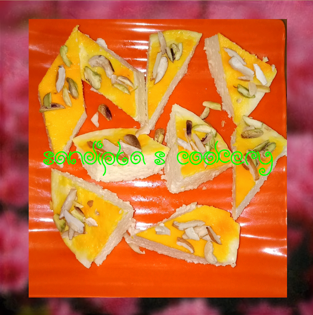 Ingredients: - 2 liters of milk + 1/4 cup, lemon / vinegar, saffron / yellow food coloring, cashew-pistachio powder, sugar (powder) to taste, cardamom powder, ghee / butter.
